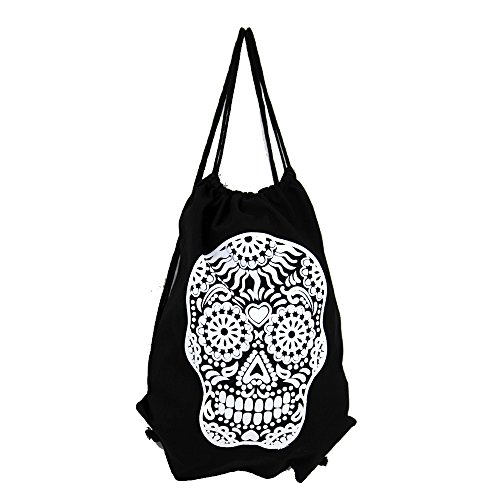 (PLB)/Game Room/Table Tennis/DIRECT FROM USA/Black Tote Bag Drawstring Backpack Sack with White Day of the Dead Skull Cotton