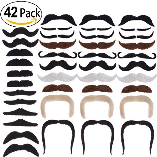 - PChero Mustaches are made from soft fuzz. Enough mustaches(16 different designs, total of 42pcs mustaches) that for your use. Depending on the style, each mustache measures approximately 2-4 inches long, suit for kids and adults.