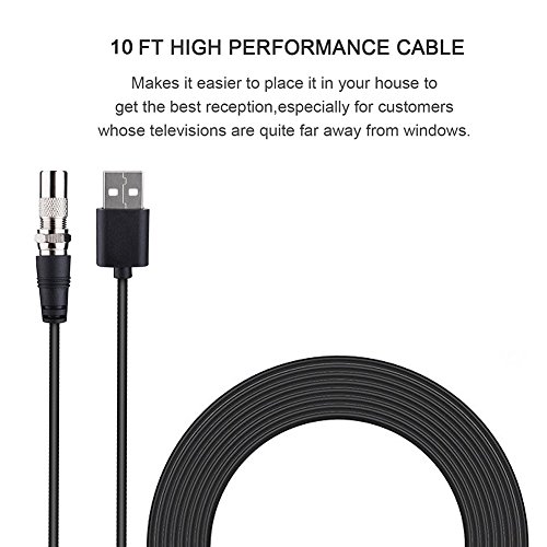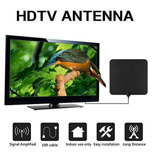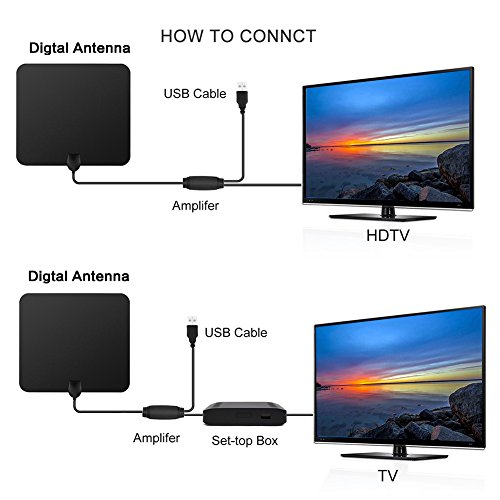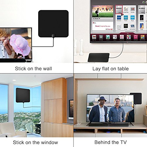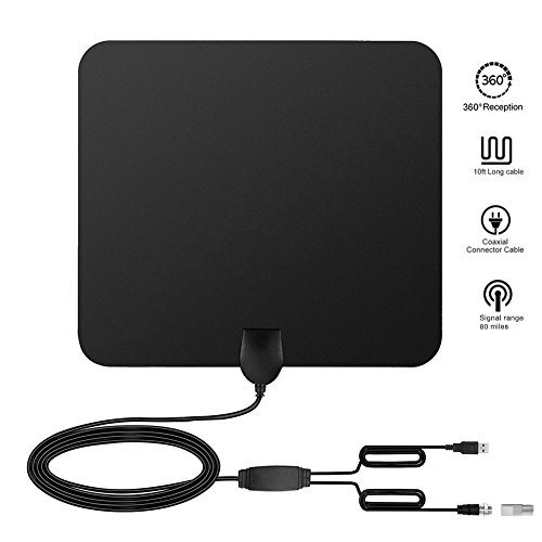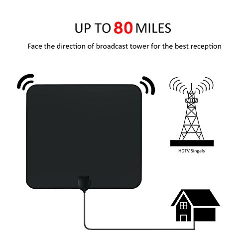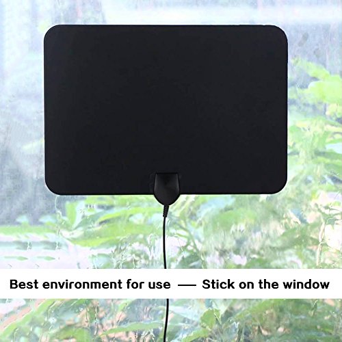 Studio : GZCNBMYUS Publisher : GZCNBMYUS Binding : Electronics Product Description Specifications: 1. Reception Range: 80 miles 2. Working Frequency: VHF(172-240Mhz) \ UHF(470-860Mhz) 3. Current Consumption : 20mA 4. Operation Temperature: -45 ~ 85°C 5. Storage Temperature: -45 ~ 85°C 6. Compatible with 720p, 1080i, 1080p/ ATSC 7. VSWR: ≤1.5 8. Impedence: 75 Ω¸ 9. LNA Gain: 25dB 10. Connectors: F Male 11. Size: 330*300*0.6mm 12. Cable: 1.5C-2V / Black, L=4M 13. Polarization: Linear 14. Voltage: 5V 15. Power Supply Connector: USB Note: 1. If you are using a flat screen HDTV, please check your TV's manual to make sure your TV has a built-in tuner for receiving over-the-air broadcasts. 2. You should retune your TV and digital box from time to time to ensure you are receiving all available services. Retuning takes only a few minutes and can be done with your remote control. 3. Make sure your tuner can receive HD signals, otherwise you won't be able to receive and watch HD channels. When you buy it before, pls find out what channels are available in your area. 4. Signal quality determines the number of channels you can get, and image quality. Try to move your antenna and Re-scan TV channels to find the best location signal. When you re-scan for channels after moving the antenna. 5. The number of channels you get is determined by what's being broadcast in your area, how far away you are from the towers, and your surroundings.Areas with large obstructions such in valleys, mountains, buildings etc will reduce effective range. Always re-scan for TV channels after moving the digital TV antenna, the result may be better. How to use: 1. Connect to 'ANTENNA IN' on the back of any digital TV. 2. Place amplified antenna in an optimal position, usually window or on a wall. 3. Scan channels. Package included: 1 x Digital HDTV antenna with build-in amplifier 1 x instruction manual 1 x IEC Connector