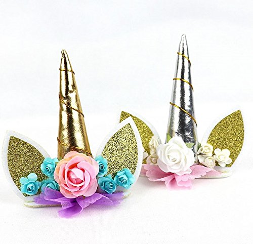 (PalkSky)/Stationery Party Supplies/Party Supplies/DIRECT FROM USA/Handmade Gold Unicorn Birthday Cake Toppers set. Unicorn Horn, Ears and flowers Set. Unicorn Pa...