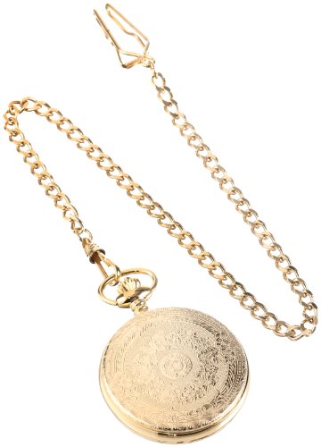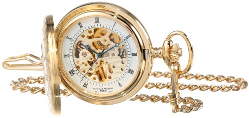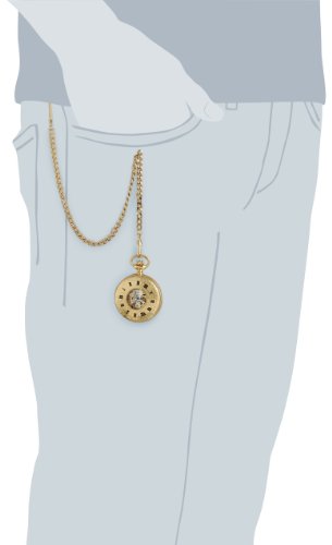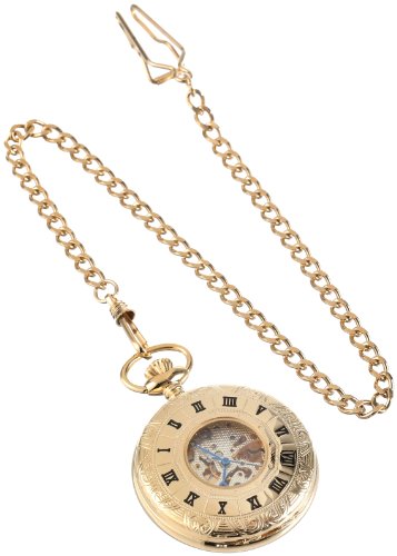 -. Feature : 14k gold-plated brass 48mm demy hunter case with a matching curb chain / Skeleton dial with roman numerals / 17 jewel mechanical movement / Deluxe gift box