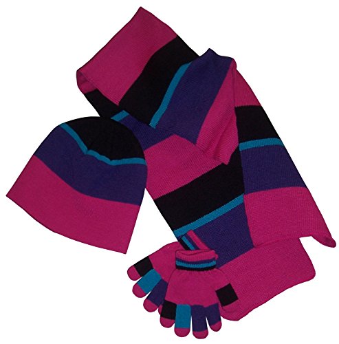 Binding : Apparel Product Description N'Ice Caps TM kids 3 piece set with magic stretch glove. 2 ply construction for added comfort and warmth. Colors: fuchsia/purple/turq/black, black/charcoal grey/silver grey/royal. One size fits 3-6yrs. Tested and approved as per CPSIA standards. 0