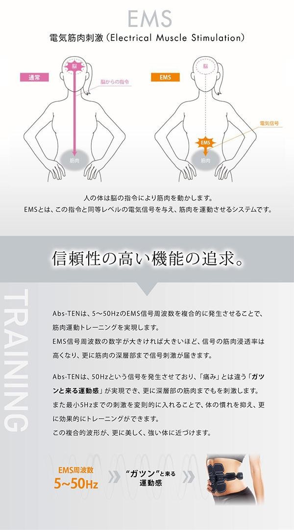 | Abs-TENは、20分間の自動プログラミングがされており、刺激レベルは1~15段階とお好みに合わせて設定できます。10個のパットで筋肉を刺激するので、「上腹筋~下腹部」はもちろん「体の横ライン」や「背中や脇腹」等もトレーニング出来ます。さらに、付属のフィットベルトを組み合わせて使用することで「太もも」や「二の腕」にも使用できます。充電はUSBケーブルでパソコン等に接続するだけです。 |