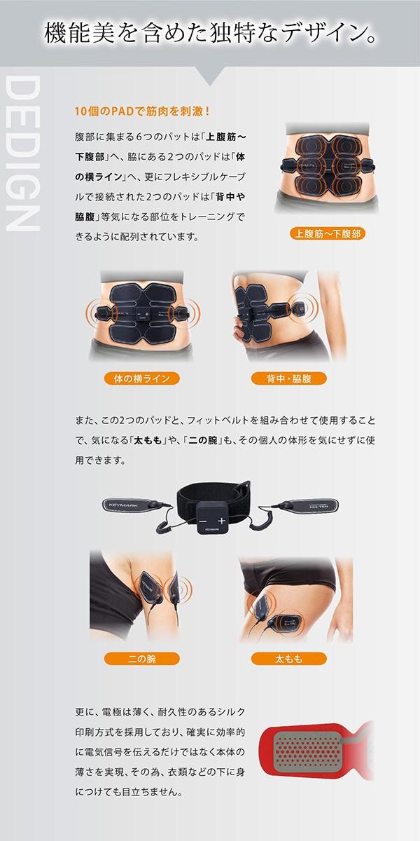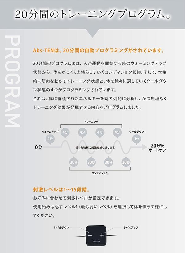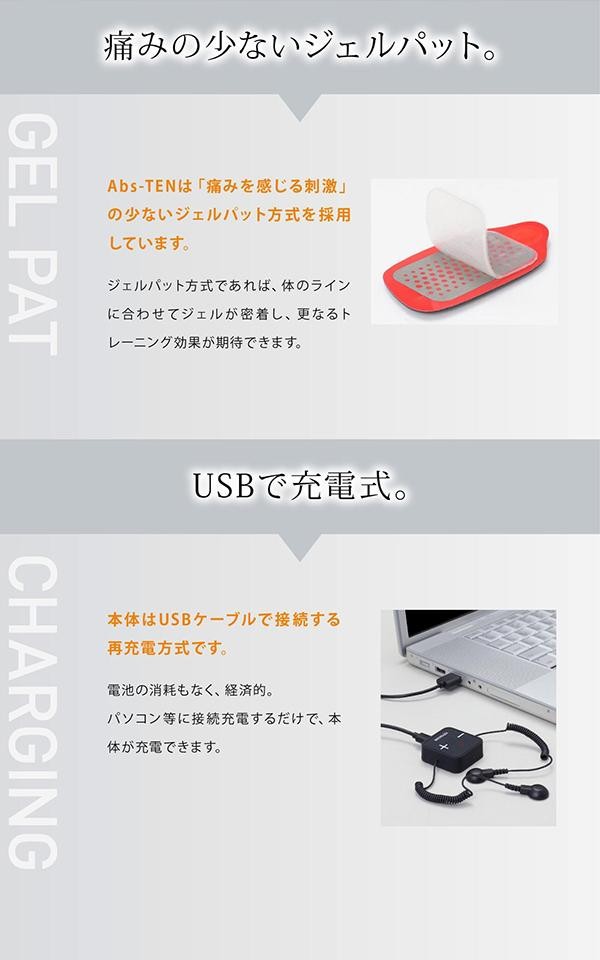 Abs-TENは、20分間の自動プログラミングがされており、刺激レベルは1~15段階とお好みに合わせて設定できます。10個のパットで筋肉を刺激するので、「上腹筋~下腹部」はもちろん「体の横ライン」や「背中や脇腹」等もトレーニング出来ます。さらに、付属のフィットベルトを組み合わせて使用することで「太もも」や「二の腕」にも使用できます。充電はUSBケーブルでパソコン等に接続するだけです。 |