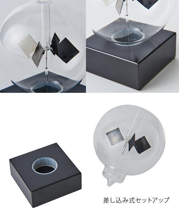 | 光熱に照らされるとガラス内の4枚の羽が回転します。窓辺に置けば太陽光で、室内にあれば白熱灯などに反応して回転し続けます。光の強弱に比例して、回転する速度が変化します。 |