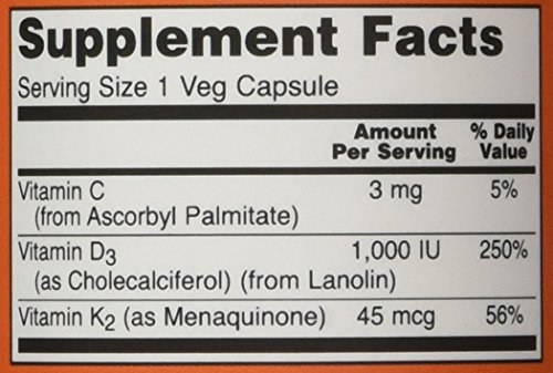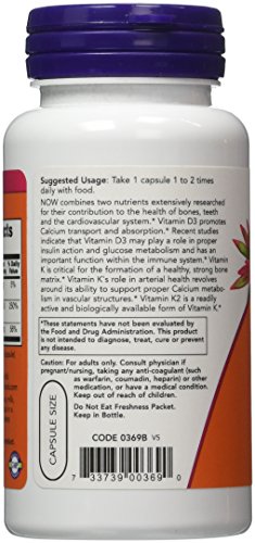 Vitamin D-3 & K-2 1,000 IU / 45 mcg Supports Bone Health Plus Cardiovascular Support* NOW® combines two nutrients extensively researched for their benefits for the bones, teeth and cardiovascular system. Vitamin D3 promotes calcium absorption and calcium transport to bones. Recent studies indicate that Vitamin D3 may support healthy insulin action and glucose metabolism and may have a positive impact on immune function. Vitamin K2, likewise is beneficial in the areas of bone and cardiovascular health. Vitamin K is critical for the formation of healthy strong bone matrix. Bone quality is dependent on the presence of adequate Vitamin K. Vitamin K's role in arterial health revolves around its ability to support proper calcium metabolism in vascular structures. Vitamin K2 is the most biologically active form of Vitamin K.