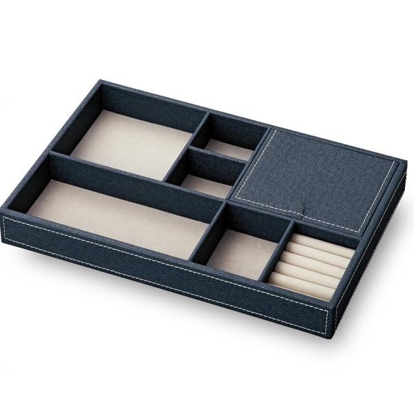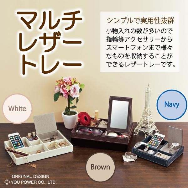 小物入れの数が多いので、指輪等アクセサリーからスマートフォンまで様々な物を収納する事ができる、フェイクレザーのトレーです。