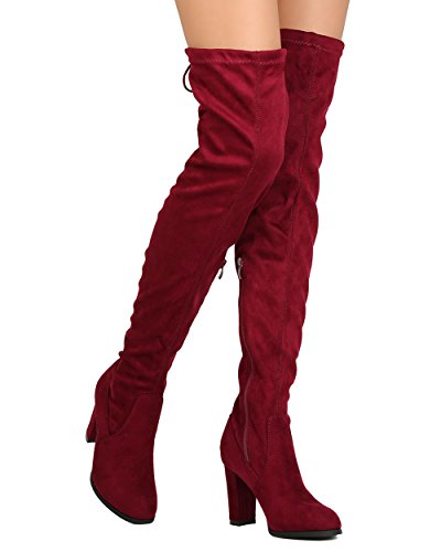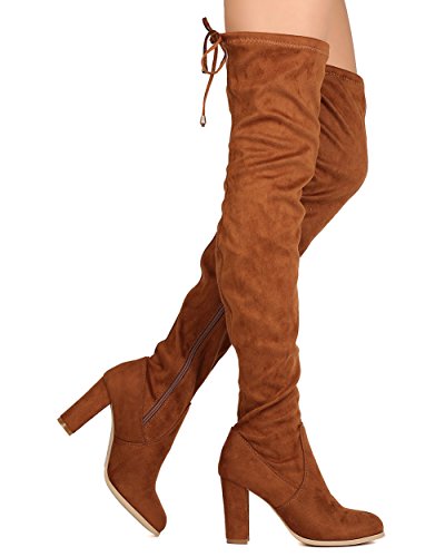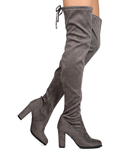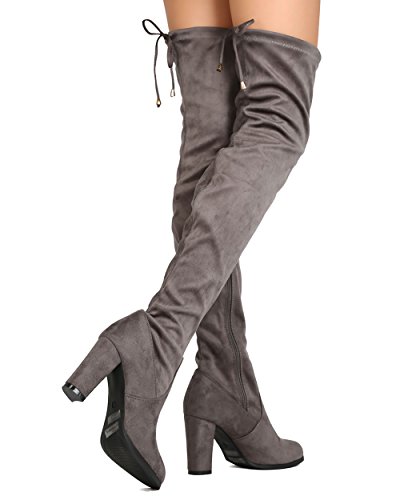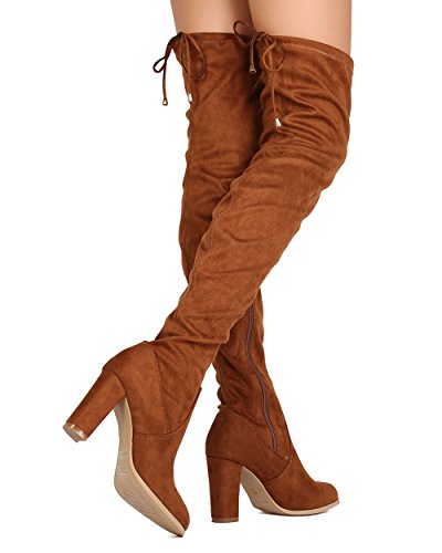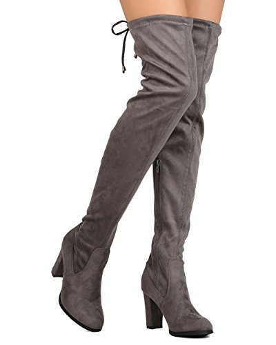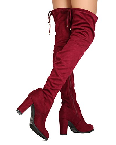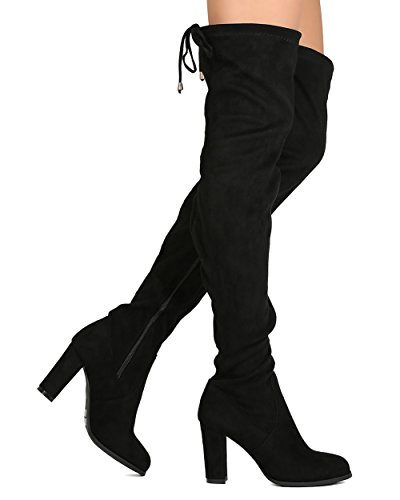 Studio : Refresh Publisher : Refresh Binding : Apparel Product Description These thigh high boots are made with a faux suede upper, rounded almond toe, and stitch accents. The drawstring tie at the opening is all the craze right now. Also made with a covered chunky heel and side zip for easy slip on and off. 0