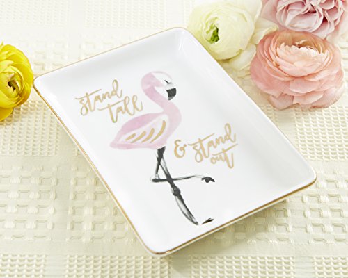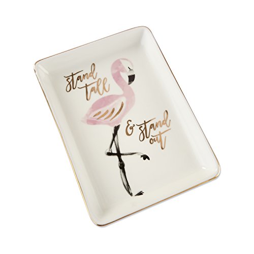 White Rectangle trinket dish with gold foil trim around edges. The center of the trinket dish features a pink flamingo with black and gold foil accents, along with the phrase "stand tall & stand out".