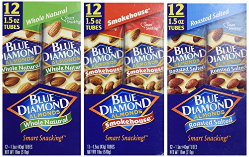 Blue Diamond Almonds – VARIETY FLAVORS - Whole Natural, Smokehouse, Roasted Salted (Box of 36 / 1.5-Ounce Bags)