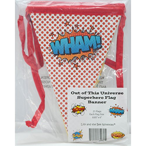 -. Binding : Toy -. Brand : Lilly and the Bee Novelties -. EAN : 0700115649605 -. Feature : Set includes 3 pennant banners each with 7 flags. Each pennant is about 42 inches long. / Each flag is size 8. 85 inches long and 6 inches wide. / Each flag is made of lightweight cardboard. P.R.Int is on one side only. / Flags attached with red ribbon. -. IsAdultProduct : 0 -. Label : Lilly and the Bee Novelties -. Manufacturer : Lilly and the Bee Novelties -. MPN : LYSB0134OYFWM-TOYS -. PackageQuantity : 1 -. PartNumber : LYSB0134OYFWM-TOYS -. ProductGroup : Toy -. ProductTypeName : TOYS_AND_GAMES -. Publisher : Lilly and the Bee Novelties -. Studio : Lilly and the Bee Novelties -. Title : Out of This Universe Superhero Pennant Banner Decoration -. UPC : 700115649605