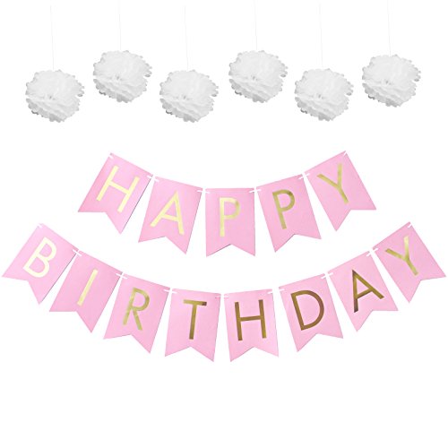-. Feature : Our happy birthday banner decoration kit will add a memorable touch to your next birthday party. / Set includes one pink "happy birthday" bunting banner with gold-foil letters, and six white tissue-paper pom poms. / Banner measures approximately 8 feet and pom poms are 8 inches in diameter. / Easy to assemble so you can focus on all your other party planning tasks. / Use this as a beautiful backdrop behind a cake table, and hang the pom poms from the ceiling, light fixtures, tree branches, veranda and more. Reuse this over and over for years to come.