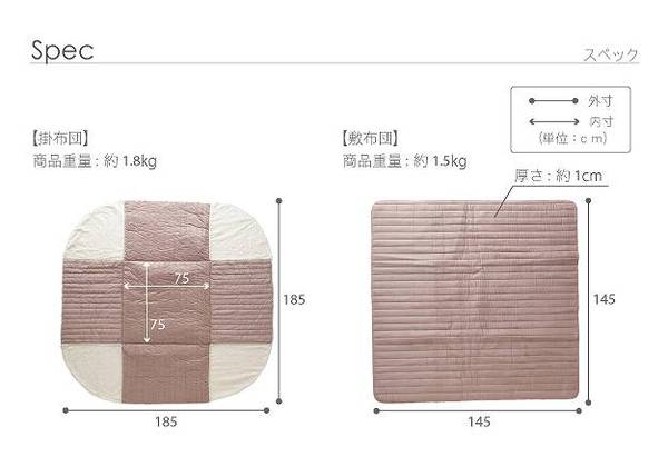 サイズ(cm):掛布団-185x185cm・約2kg、敷布団-145x145cm・約1.5kg