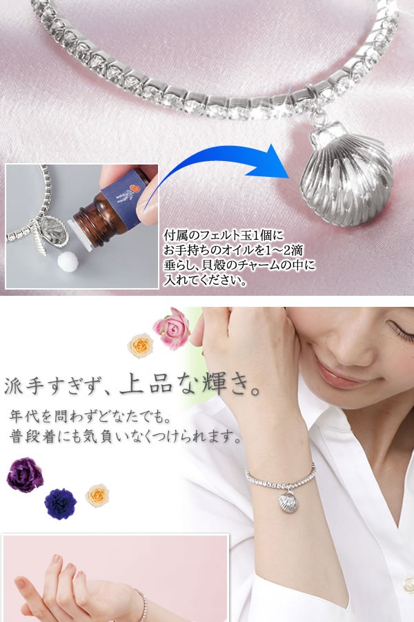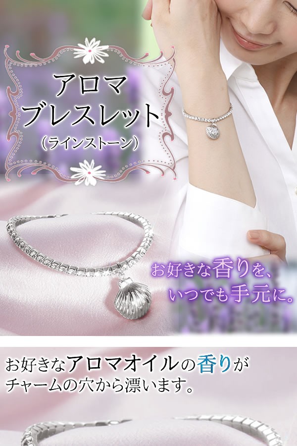 | 付属のフェルト玉にお好きなアロマオイルを染み込ませ、貝殻のチャームに閉じ込めると、手首からふわっと香りが漂います。シンプルなフォルムにラインストーンがきらりと輝く上品なデザイン。フェルト玉が無くなれば、ご自宅のコットンやティッシュなどで代用できます。アロマ/ブレスレット/アロマアクセサリー/アロマアクセ/ラインストーン/ビジュー/シルバー |