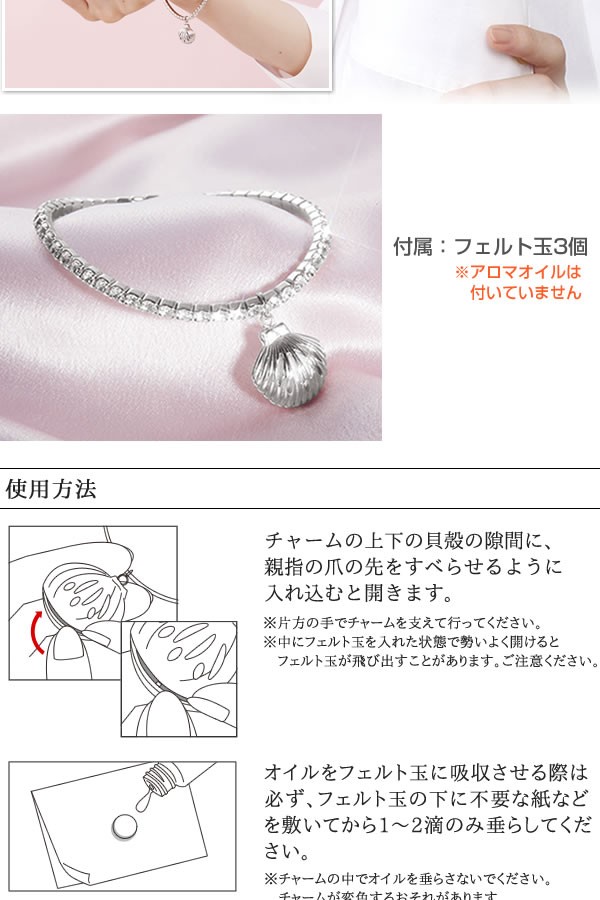 | 付属のフェルト玉にお好きなアロマオイルを染み込ませ、貝殻のチャームに閉じ込めると、手首からふわっと香りが漂います。シンプルなフォルムにラインストーンがきらりと輝く上品なデザイン。フェルト玉が無くなれば、ご自宅のコットンやティッシュなどで代用できます。 |