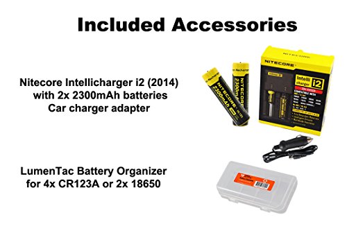 Bundle Includes the newest Nitecore HC30 1000 Lumen Headlamp with two high-capacity 18650 rechargeable batteries, i2 smart charger, Car AC adapter, and LumenTac battery organizer.