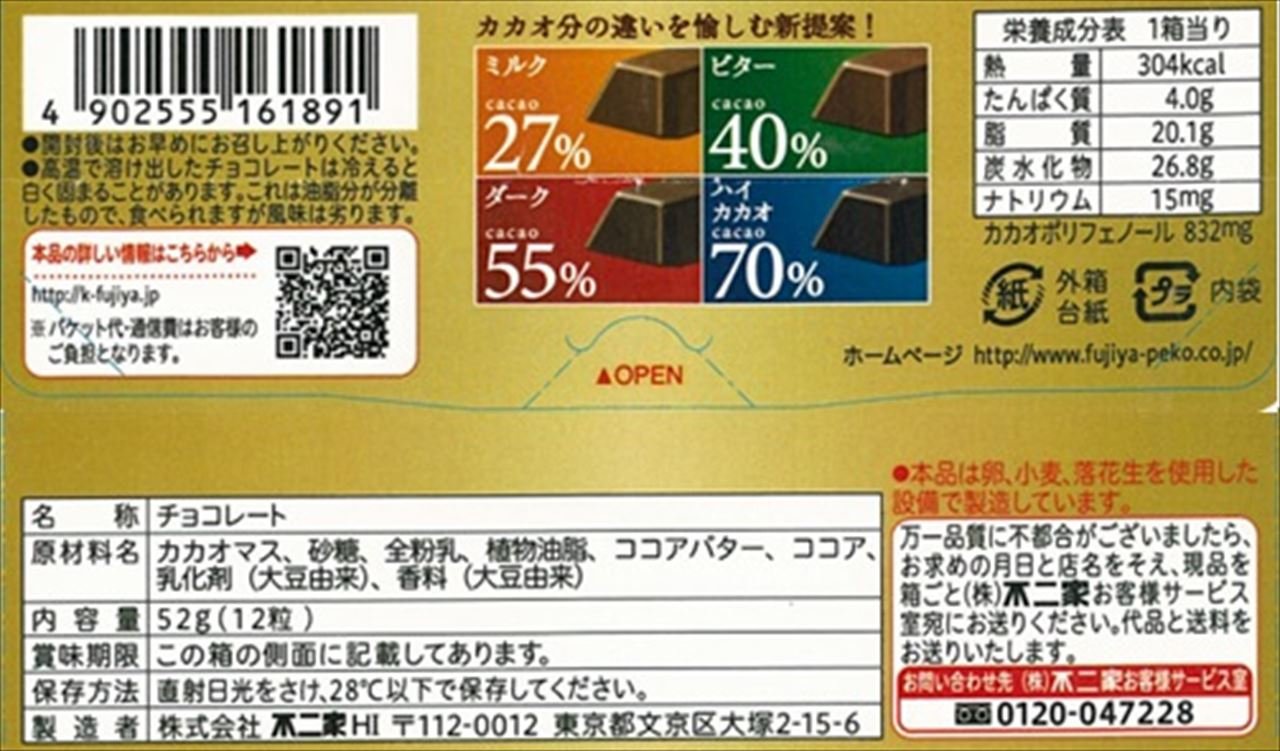 原材料:カカオマス、砂糖、全粉乳、植物油脂、ココアバター、ココア、乳化剤(大豆由来)、香料(大豆由来)