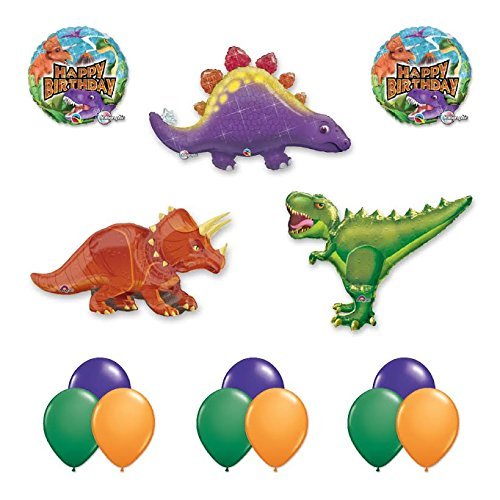 -. Feature : (1) 42" TRICERATOPS Foil Balloon / (1) 44" STEGOSAURUS Foil Balloon / (1) 36" T-REX Foil Balloon / (2) 18" Round Birthday Dinosaur Foil Balloons / (9) 11" Latex Balloons: 3 Green - 3 Orange - 3 Purple