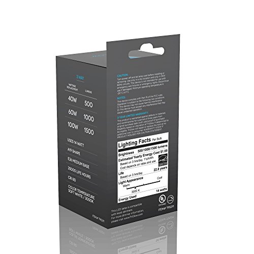 TriGlow T95211 LED Dimmable 3-WAY Bulb, 14 Watt (40W/60W/100W Equivalent) 3000K (Soft White Color), UL Listed and Energy Star Approved A19 LED Light Bulb