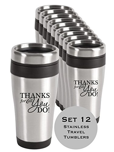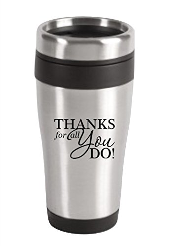• Thank You 14 oz Stainless Tumbler • Gift Card Message Available • Special Occasions - What a fabulous keepsake and way to say Thank You than with this quality 14 oz stainless tumbler with "Thanks For All You Do" printed in black, delivered right to their door,for the coffee lover. Perfect for corporate gifts, employee appreciation gifts, men, and woman. Just add-to-cart and we'll do the rest. The best corporate thank you for business, referrals and more. • Thank You Gifts made easy. Perfect gift for office staff, corporate gift, business client gifts and more. Quantity Discounts Available. Ask about adding your company logo.14 ounces Stainless steel with an insulated black plastic liner Twist on/slide open black plastic lid.Feature