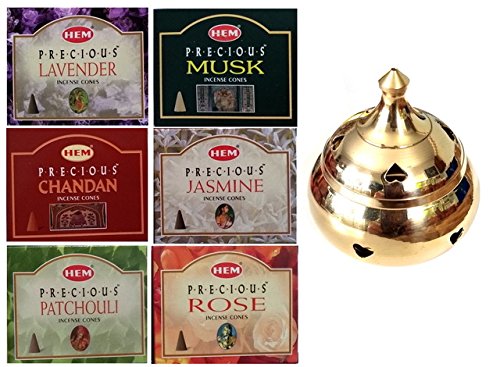 Brass Heart Cone Incense Burner and 6 boxes of Hem Precious Incense bundle, Lavender, Musk, Chandan, Patchouli, Rose, Jasmine, 60 cones total