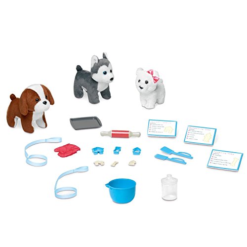 Doll wears a baker's outfit and includes toy baking accessories and plush dogs, includes 24 pieces