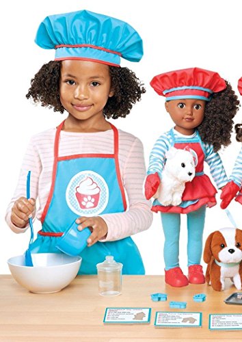 The My Life As a Doll Pet Treat Baker playset includes an 18" My Life As a Doll, plush pets and the baking accessories needed for fun pretend play making pet treats. The doll is dressed in an apron and hat, and a matching apron and hat is included for your child. Also included are a doll-size mixing bowl and spatula, oven mitt, cookie cutters, baking sheet, pet treats, recipe cards (with real pet treat recipes) and even a jar for the finished treats. This 18" doll is poseable with a soft torso, and features rooted hair to style and eyes that open and close. Most 18" doll accessories and clothing will fit her. Made of cotton, PVC and poly-blended fabric, the doll has a washable PVC surface. Child-size hat and apron will fit most childrens 5-9 years.Feature
