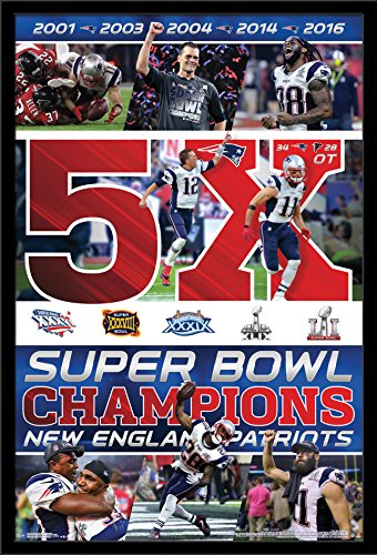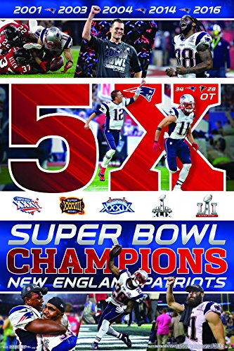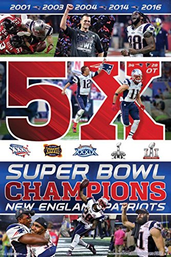 It's time to celebrate new England patriots fans with this super champions celebration collector's edition wall poster. This poster features in game and post-game photography. It features the super bowl 51 official game logo, celebration photos, official patriots emblem, the final score and the 5 super bowl Champion Logos from the patriots Victories. This is a perfect edition to your home, office, man cave, basement or sports facility.Feature