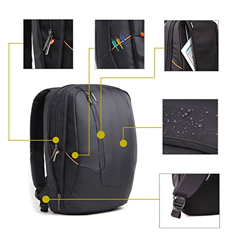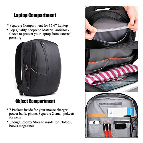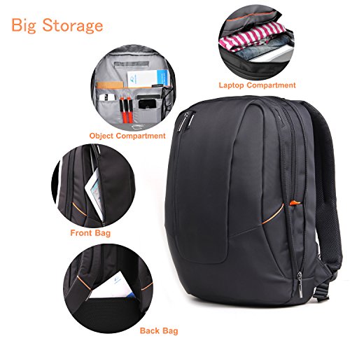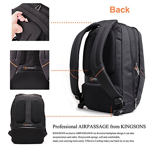 -. Feature : External Size: 448*350*124mm(17.5*13.6*4.8inch).Fit most 15.6 inch Laptop / Notebook / MacBook / Acer / Asus / Dell / Fujitsu / Lenovo / HP / Samsung / Sony / Toshiba etc / Laptop main compartment comes with Neoprene Material Sleeve Bag,which is resilience. These are shock proof and water-resistant.can fix your laptop tightly.aptop Accessories Bag.you can put AC Adaptor,Mouse,USB Flash Drives etc. Object Bag for your Wallet,Pen,Name Card,Phone etc. Inside Mezzanine for Clothes,Magazines etc.Back suspension system can hold notepad.iPad etc / Backpack Front: with Silicone Brand of Logo in front..unique and creative,genuine show. Its made of high strengthen,hot resistant and ware resistant top nylon material.After splashing water testing.water will come bead and rapidly decline / Side: It comes with a headset port on the backpack, can facilitate lining out for headset..making your listening more easy. Front pocket for Small smaller object storage like pen..More delicate with orange decoration.Metal Zipper is specially designed by KINGSONS, from oval to round, more easily to grasp / Back: Humanized design for handle, for carrying more comfortable.KINGSONS exclusive AIRPASSANGE air diversion backplane design.it can take away moisture and sultry. Honeycomb sponge, soft and comfortable, make your carrying more easily. Effective Cooling make your back try in any time