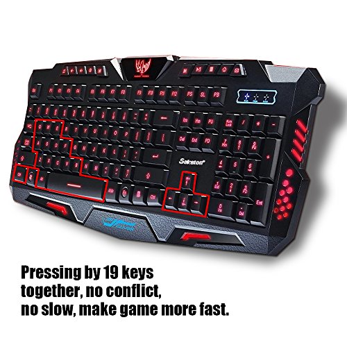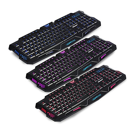-. Feature : 1.High Quality. This is a mechanical feel gaming keyboard, not the real mechanical keyboard, but tones clear, feels good, user experience is similar to mechanical keyboard. / 2.There are three colors of backlighting adjustable of the keyboard, FN+SL to witch the colors of backlighting ,The three colors are blue, purple and red. There are three levels of brightness(33%,66% and 100%)adjustable, FN+↑ or FN+ ↓ to adjust it. / 3.Specially designed keys for enhanced durability and tactile feedback, mechanical keyboard feeling.The104 keys, 19 keys non-conflict, mechanical feel keyboard, strengthened space key. / 4.The keyboard has 10 multimedia keys, You can use it to play music, adjust the volume or make it silent; the others shortcut keys can be used to launch E-Mail and homepages. / 5. USB plug and play, no driver needed. Anti-skid and waterproof design. the back reserved 8 outfall of water. ABS material, laser-etched, non slip design, splash proof and durable. Easy to Operate.