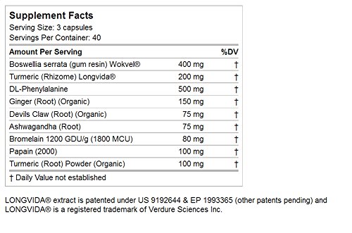 -. Feature : Helps comfort and soothe aching muscles & joints* / Supports normal joint response to exercise* / Helps with sleep & mood* / Contains 9 specialized herbs and nutrients: Boswellia serrata Wokvel, Turmeric Longvida, DL-Phenylalanine, Ginger, Ashwagandha, Bromelain, Papain, and Turmeric Powder. / Serving Size: 3 capsules Servings Per Container: 40