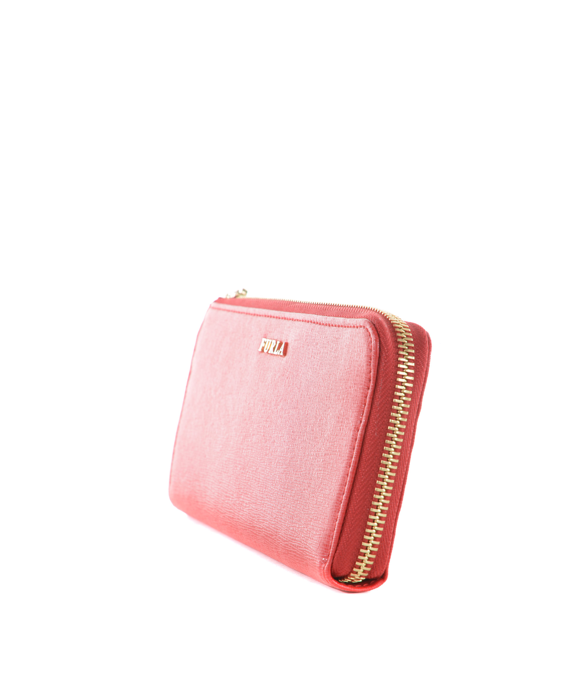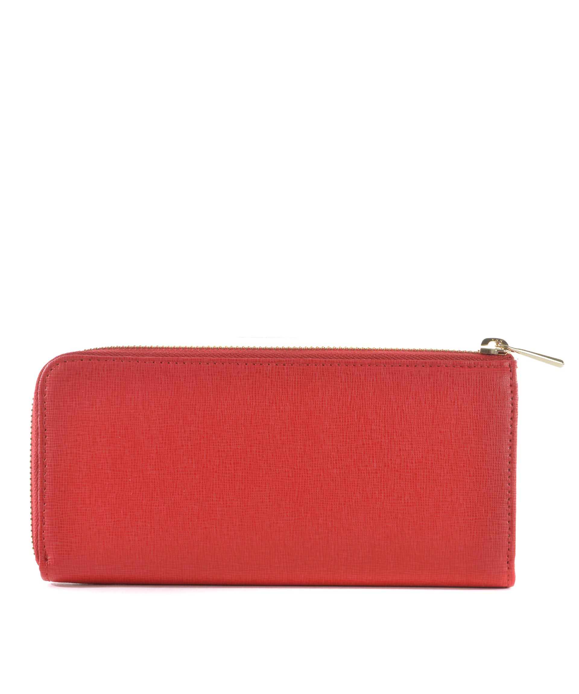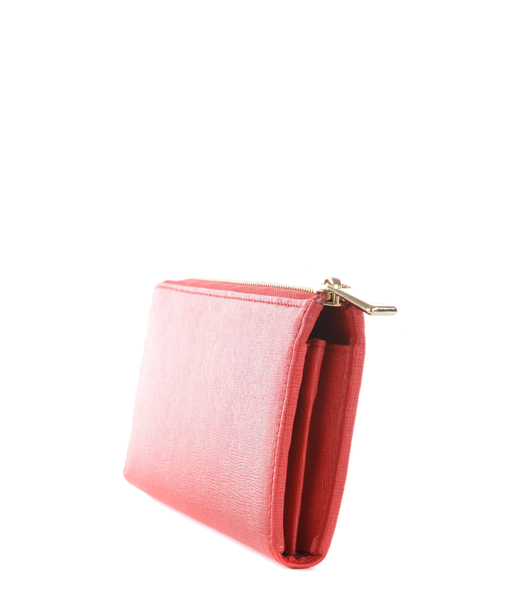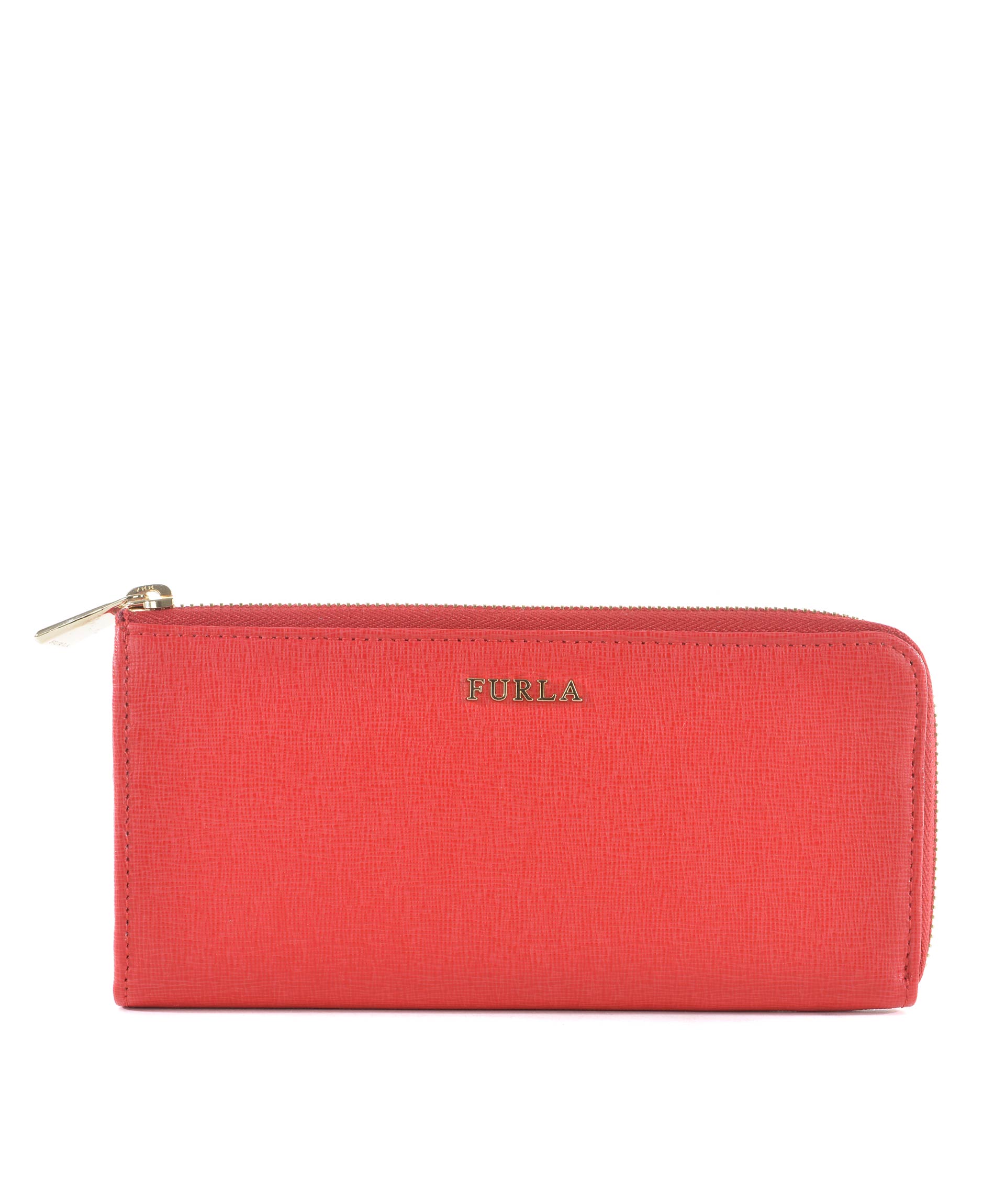 Portafogli Furla in pelle stampa saffiano Rosso. Apertura con zip dorata. All'interno tasca centrale con zip, scomparti per banconote, tasche per carte di credito. Logo frontale in metallo dorato.