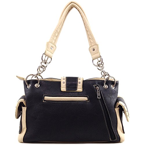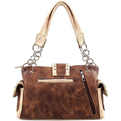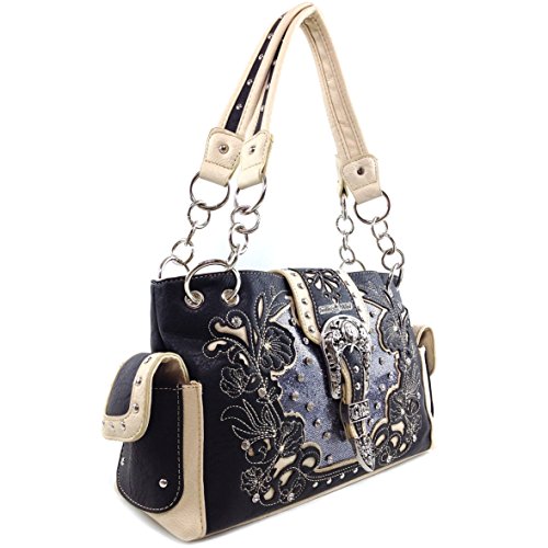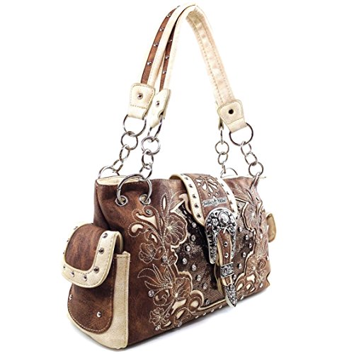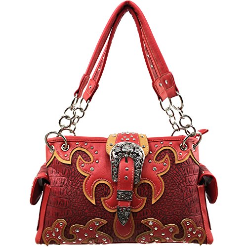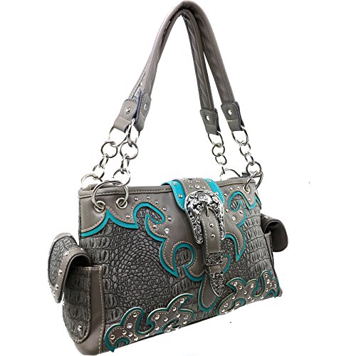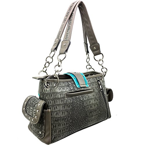 -. Brand : Justin West -. Department : womens -. Feature : Beautiful Western Buckle Design - Proudly Designed in the United States / Handbag Measurements: 13" X 8.5" X 4.5" / Top Zipper Closure with Buckle, Multiple Interior Pockets / Two Side Pockets / Back Conceal Carry Pocket with Phone Pocket -. PackageQuantity : 1 -. ProductGroup : Shoes -. ProductTypeName : HANDBAG -. Title : Justin West Concealed Carry Western Croc Buckle Duo Color Shoulder Handbag Purse