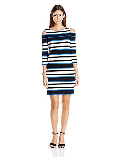 -. Title : Sandra Darren Women's Petite 1 Pc Cold Shoulder 3/4 Sleeve P.R.Inted Striped Shift Knit Dress Black/Ivory/Cobalt 10P [並行輸入品]