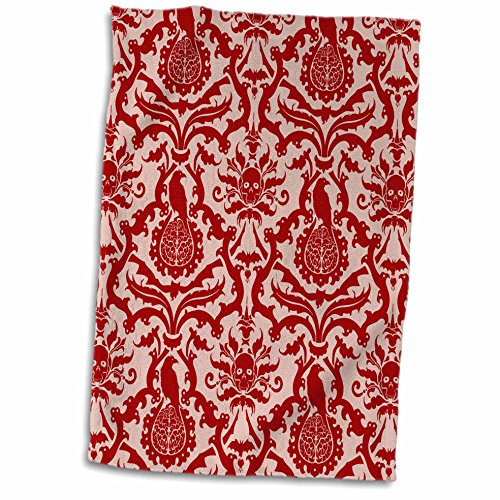 3D Rose Bats-Ravens-Brains and Skulls Goth Horror Damask Pattern in Red Hand Towel, 15" x 22"