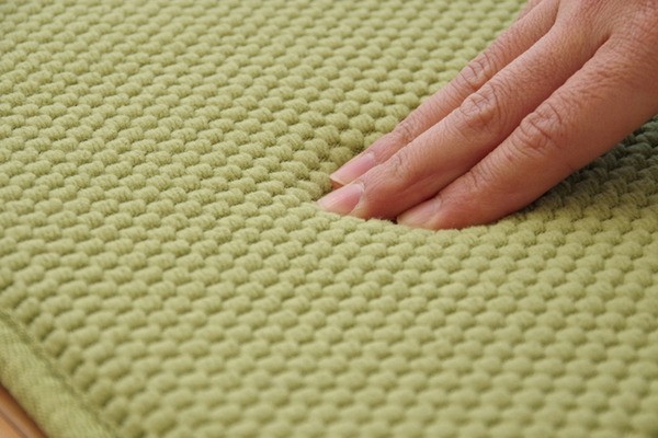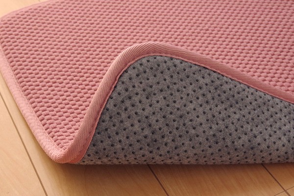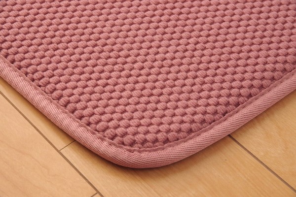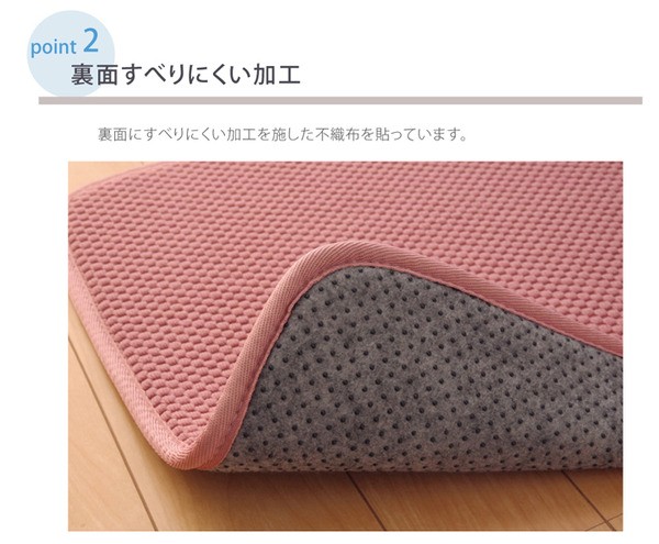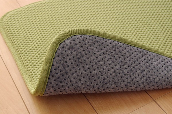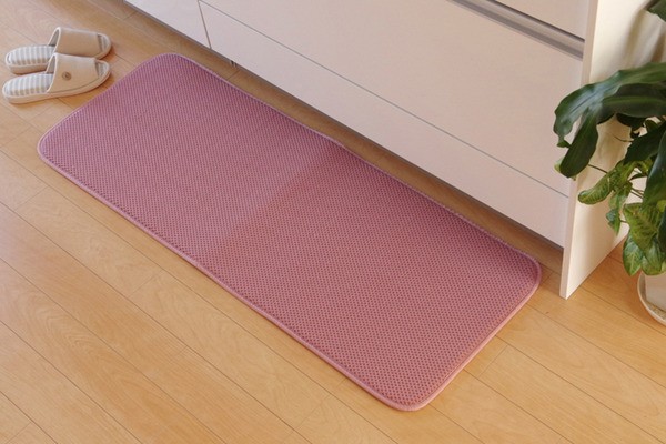 無地のシンプルなキッチンマットです。中材には低反発ウレタンフォームを使用しています。立ちっぱなしのキッチンでも足が疲れにくいように工夫しました。裏面には滑りにくい加工を施しており、シンプルな色味はキッチンの雰囲気を崩さずにご使用いただけます。