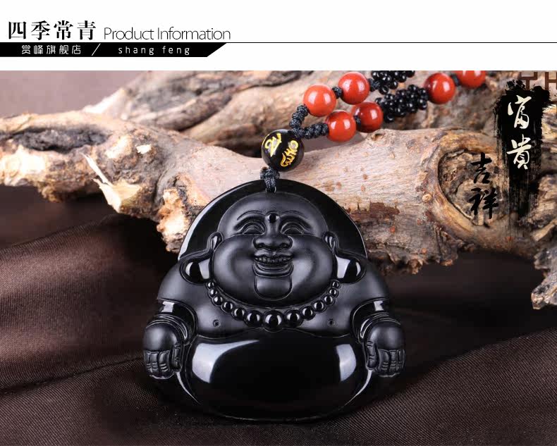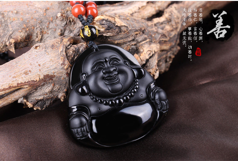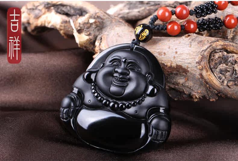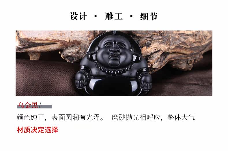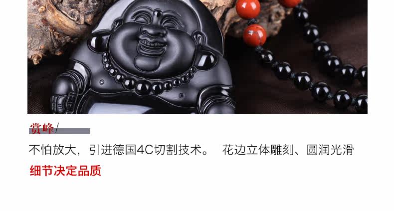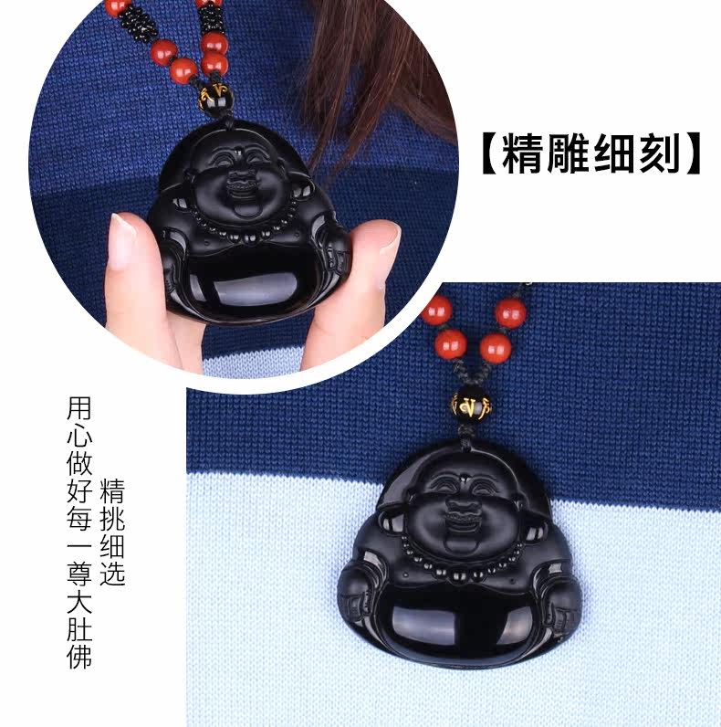 开光本命年天然黑曜石弥勒佛头磨砂佛像大肚佛吊坠女项链挂坠