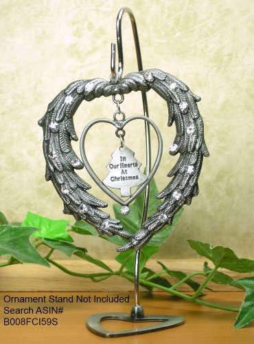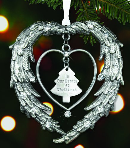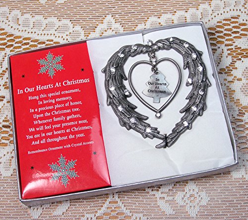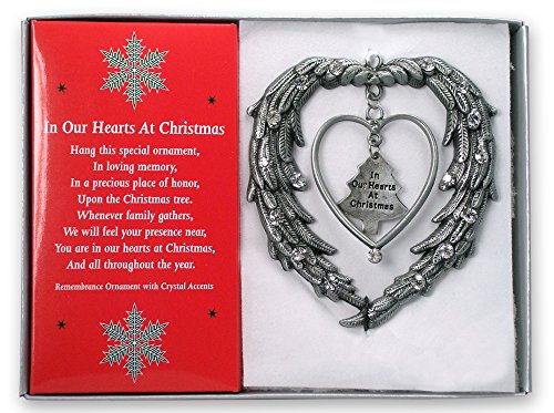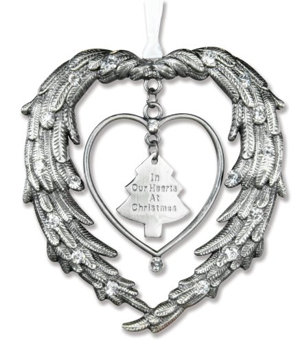 -. Feature : Remembrance Ornament engraved with "In Our Hearts At Christmas" / Engraved tree in a heart encircled with crystal accented angel wings / Brushed metal in a message gift box / Measures 3.5" x 3"