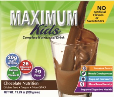 Research shows that most children do not meet the recommended daily intake for many vitamins and minerals through diet alone. Maximum Kids is a Complete, Organic, and Balanced Nutritional Supplement designed to solve this nutritional deficit. Every serving of Maximum Kids serves a complete ORGANIC nutrition with 26 Vitamin and Minerals, such as Calcium and Iron, plus 20 grams of plant protein, and 3 grams of fiber which are important for your child's development. Most importantly it is made with WITHOUT artificial colors, flavors, or sweeteners and is also NON-GMO. Maximum Kids is a suitable drink for between meals, at home, at school, or on-the-go. Your child will LOVE it for the taste, and you will LOVE it because you will be sure your child is getting the nutrition needed to support his or her growth and development.Feature
