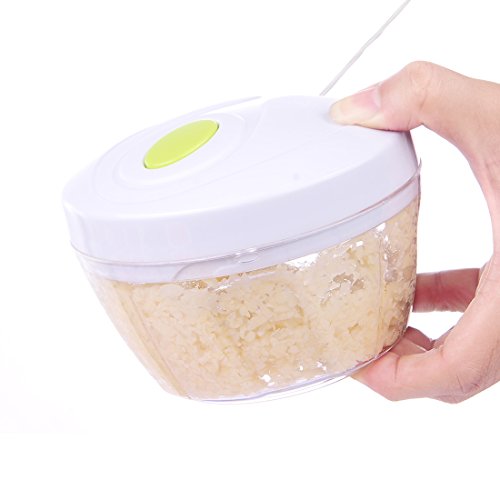 -. Feature : Food Chopper features sharp stainless steel blades for fast and even chopping/mincing, comfort soft grip lid, anti-skid base, easy pull cord, and a large handle ideal for easy leverage. / Perfect for slicing vegetable/fruit salads, cutting various foods for baby, herbs, veggies, pesto, hummus, salsa, guacamole, meat for meatloaf, ice, and more. It can be used equally well as a vegetable chopper, salad chopper, onion chopper, garlic chopper, herb chopper or as a general-purpose manual food chopper. / Great for small kitchens, RVs, travel and camping. Made from BPA free, food safe plastic. Blades are all concealed during use for the utmost safety / EASY CLEANING: Blades and bowl are top-rack dishwasher safe. Components come apart for easy cleaning. / HOW DOES IT HELP YOU? It's convenient to use, and makes vegetable preparation fun and easy. This hand food chopper takes the hard work out of chopping vegetables, fruits, nuts and herbs. It is the perfect onion chopper that doesn't make your eyes water. In just a few pulls, the patented blade mechanism begins to chop and blend your ingredients, with no electricity required