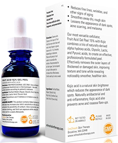 Our Best-Selling Fruit Acid Gel Peel 15% with Kojic Acid is the only tool you need to uncover natural, flawless skin. A chemical peel made of a trio of naturally-derived alpha hydroxy acids, Glycolic Acid, Lactic Acid, and Pyruvic Acid, smoothes fine lines and prevents acne breakouts.