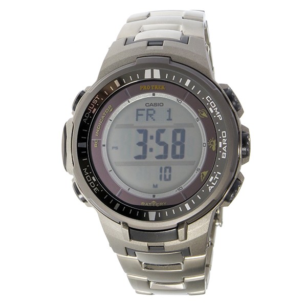 クオーツ、10気圧防水、タフソーラー(ソーラー充電システム)、電波受信機能:日本、北米地域、ヨーロッパ地域、中国対応、方位計測機能、ベアリングメモリー、磁気偏角補正機能、方位補正機能、気圧計測機能、気圧傾向グラフ表示、気圧差グラフィック、気圧傾向インフォメーションアラーム、高度計測機能/相対高度計、高度メモリー、登山記録データ14本、高度差計測、計測間隔設定機能、温度計測機能、ワールドタイム:世界48都市(31タイムゾーン、サマータイム設定機能付き)+UTC(協定世界時)の時刻表示、日の出・日の入時刻表示、ストップウオッチ、タイマー、時刻アラーム5本(1本のみスヌーズ機能付き)・時報、バッテリーインジケーター表示、パワーセービング機能、フルオートカレンダー、12/24時間制表示切替、耐低温仕様、操作音ON/OFF切替機能、LEDバックライト、フル充電時からソーラー発電無しの状態での駆動時間、機能使用の場合:約7ヵ月、パワーセービング状態の場合:約23ヵ月、カレンダー付き(日付、曜日)注:この時計はソラーウォッチです。開封時には止まっているまたは2秒運針している場合がございます。不具合ではございませんのでご使用になる前に光を当てて十分に充電してください。充電の目安については各取説をご確認ください。、カラー:液晶(文字盤)、チタニウムシルバー(ベルト)