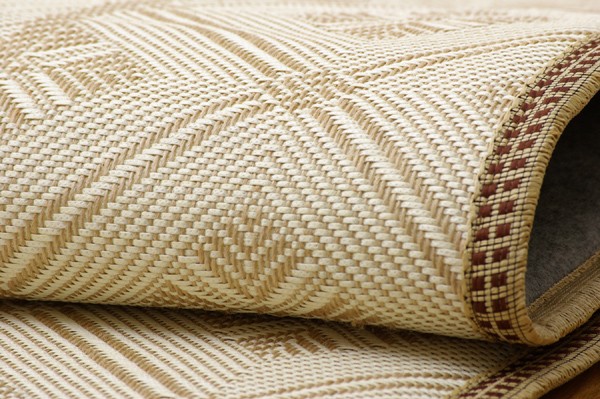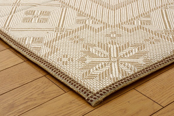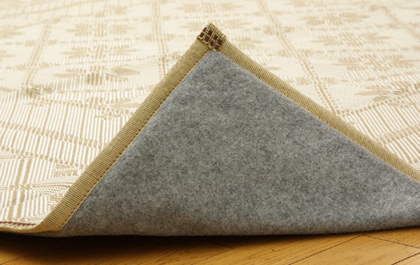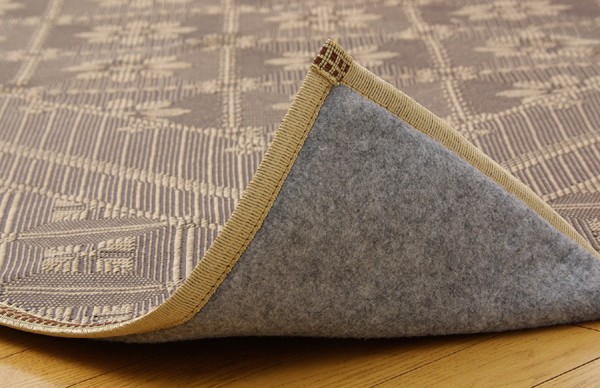 麻糸とポリエチレン糸のジャガード織りのカーペットです。横糸には麻糸を使用しています。熱伝導率に優れ、通気性が良く、夏ものの衣料や寝装具などに用いられることの多い素材です。また適度な光沢があり、強度に優れているのが特徴です。中材にはクッション性にこだわりウレタン10mmを使用しました。プニプニとした柔らかい感触をお楽しみ下さい。裏にはフローリングを傷つけにくいよう不織布を貼っています。