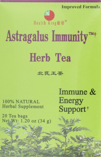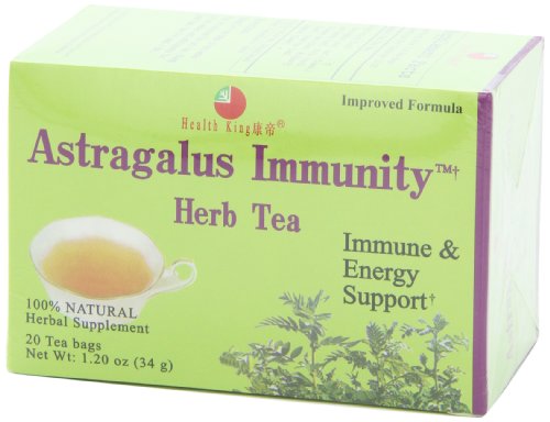 -. Binding : Health and Beauty -. Brand : Health King -. Feature : proven formula used for centuries. / Taste great for both hot and iced tea. / individual tea bags without metal staples / most herbs used are hand picked wild herbs / well sealed to keep freshness -. IsAdultProduct : 0 -. Label : Health King -. Manufacturer : Health King -. MPN : 239010 -. NumberOfItems : 4 -. PackageQuantity : 4 -. PartNumber : 239010 -. ProductGroup : Health and Beauty -. ProductTypeName : HEALTH_PERSONAL_CARE -. Publisher : Health King -. Size : 20 BAG -. Studio : Health King -. Title : Health King Astragalus Immunity Herb Tea, Teabags, 20-Count Box (Pack of 4) -. UPC : 646322000108