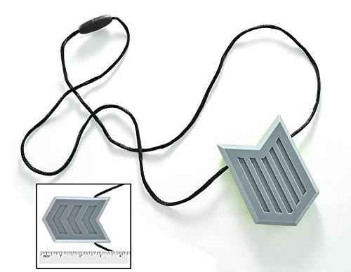 - CHEW WITH HONOR – Our Hero Crest Chewelry is designed to resemble a trendy crest or shield (the rigid stripe patterns provide tactile features) so that both girls and boys can be proud to wear it around their neck. Each necklace comes with a cord, a break-away clasp, and extra clasp. The dimensions of the pendant are 3.5in x 1.65in x 0.5in. Please wash regularly for safe chewing.