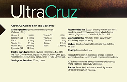 -. Binding : Misc. -. Brand : UltraCruz -. EAN : 0810500022651 -. Feature : Delicious bacon flavored chews / Also contains biotin, an important vitamin that supports healthy skin and coats in dog / Easy-to-give as healthy, tasty chews / Administer 1 tasty chew for every 30 lb of body weight twice daily / Supplied as 60 tasty chews -. Label : Santa Cruz Animal Health -. Manufacturer : Santa Cruz Animal Health -. PackageQuantity : 60 -. ProductGroup : Pet Products -. ProductTypeName : PET_SUPPLIES -. Publisher : Santa Cruz Animal Health -. Studio : Santa Cruz Animal Health -. Title : UltraCruz Dog Skin and Coat Plus Supplement, 60 chews -. UPC : 810500022651