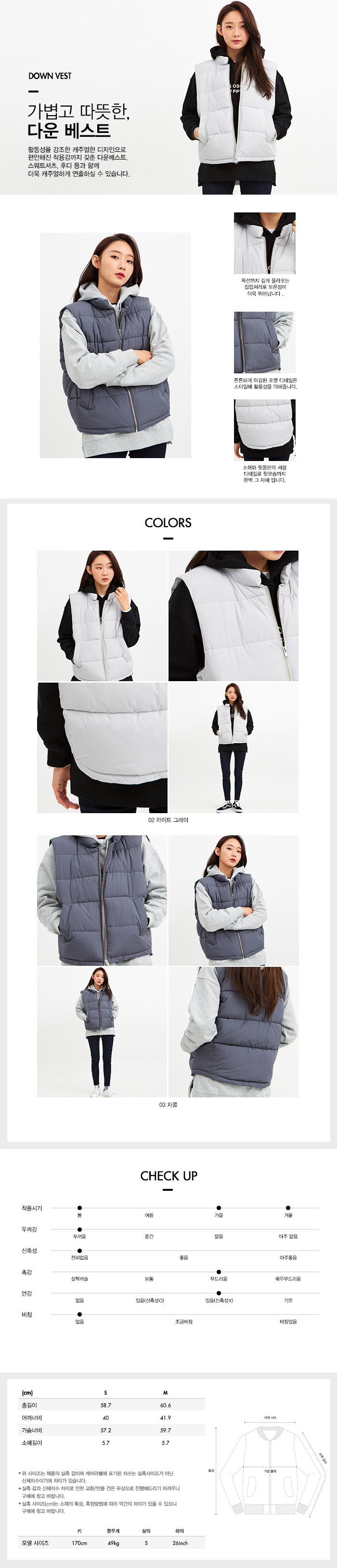 | - | 가볍고 따뜻한 다운 베스트. 활동성을 강조한 캐주얼한 디자인으로 편안해진 착용감까지 갖춘 다운 베스트. 스웨트 셔츠, 후디 등과 함께 더욱 캐주얼하게 연출하실 수 있습니다. |