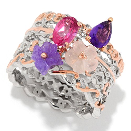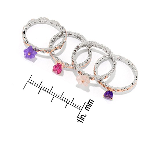 -. Binding : Jewelry -. Brand : Michael Valitutti -. Department : womens -. Feature : Set of 4 stackable rings / One each of pearshaped African Amethyst (6x4mm) 0.32ct, flower shaped Amethyst Quartz and Rose Quartz (6mm), and oval Pink Topaz (6x4mm) 0.57ct. / Total Band Width: 7-8mm / Two Tone & High polish / Measurements: 3/16"L x 3/4"W x 3/16"H -. Label : Nathan Hennick and Company -. Manufacturer : Nathan Hennick and Company -. ProductGroup : Jewelry -. ProductTypeName : FASHIONRING -. Publisher : Nathan Hennick and Company -. Studio : Nathan Hennick and Company -. Title : Michael Valitutti Palladium Silver Set of Four Multi Gemstone Carved Flower Stack Band Rings