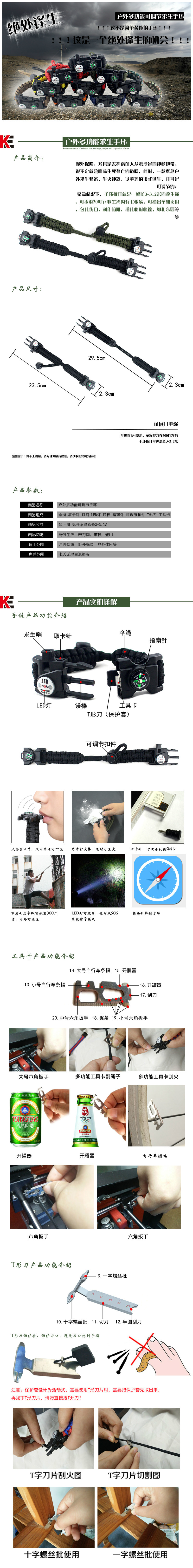 1.250DB伞绳 u0026nbsp;u0026nbsp;2.插扣 u0026nbsp;3.求生哨 u0026nbsp;4.打火棒 u0026nbsp;5.三度防水LED求救信号灯 u0026nbsp;6.取卡针 u0026nbsp;7.指南针 u0026nbsp;8.刀片保护套 u0026nbsp;9.一字螺丝刀 u0026nbsp;10.十字螺丝刀 u0026nbsp;11切刀 u0026nbsp;12.弧形刮刀 u0026nbsp;13.小号自行车调幅 u0026nbsp;14.中号自行车调幅 u0026nbsp;15开开瓶器 u0026nbsp;16.开罐器 u0026nbsp;17.刮刀 u0026nbsp;18.锯片 u0026nbsp;19.小号扳手 u0026nbsp;20.中号扳手 u0026nbsp;21.可调节尺度大小