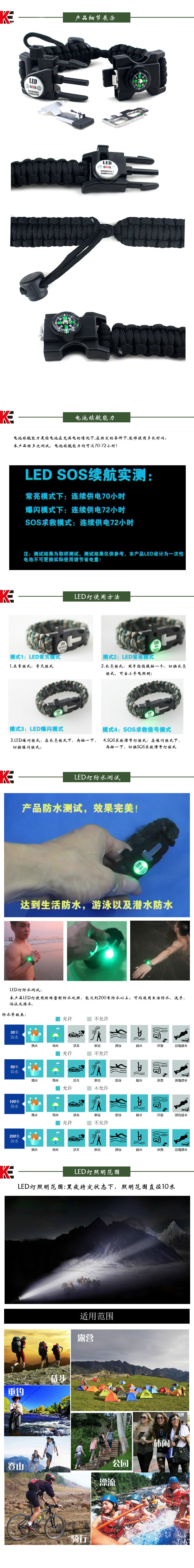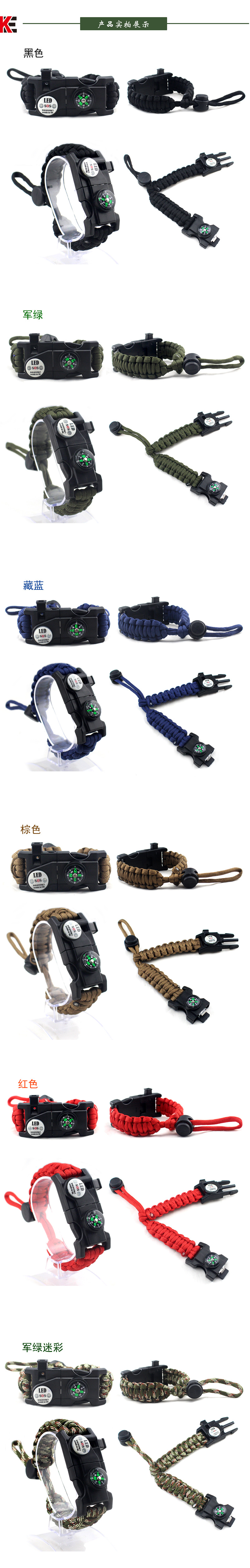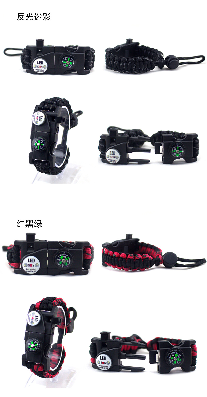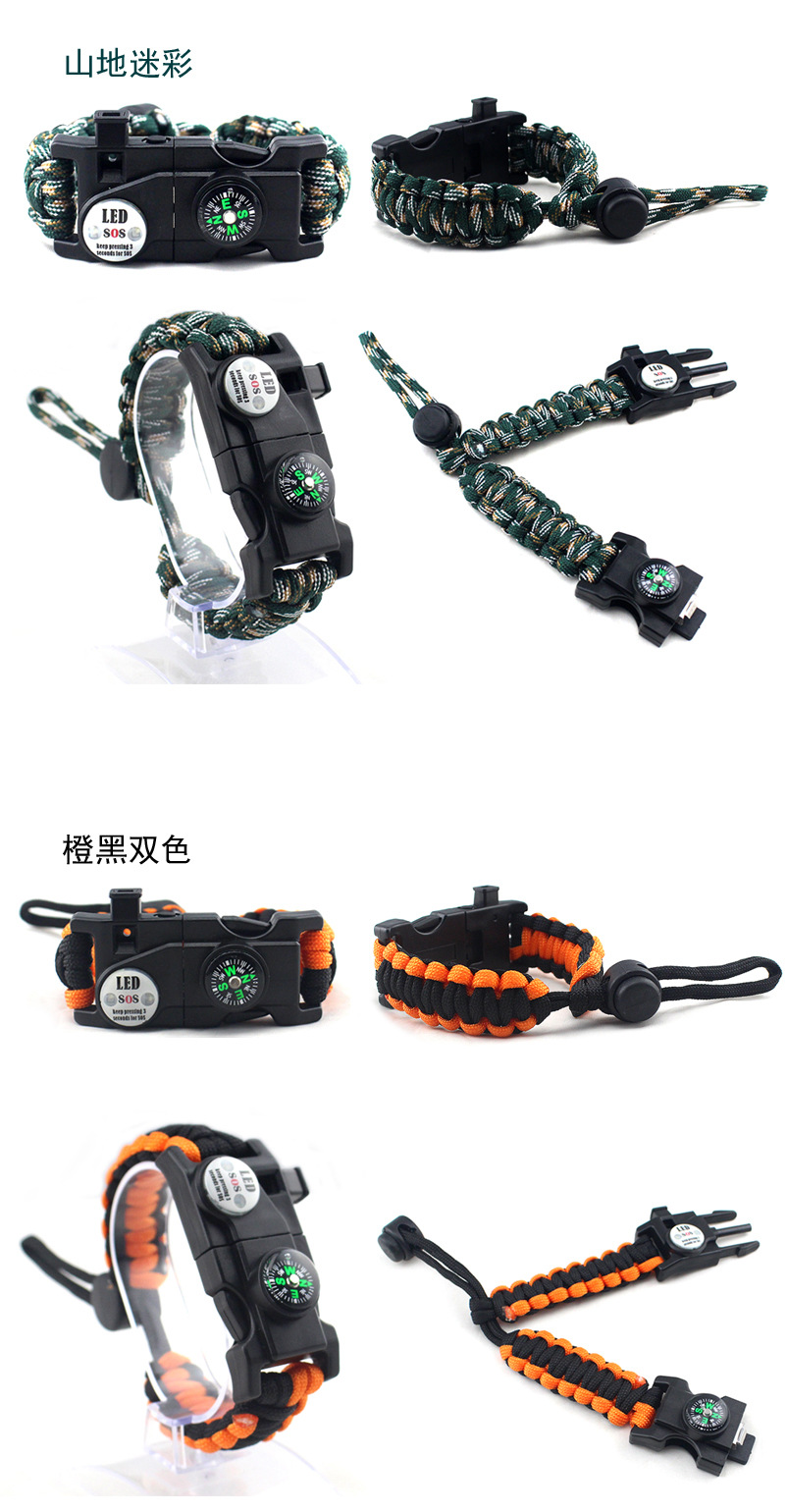 野营户外多功能LED灯SOS求救信号灯手环伞绳编织可调节求生手链